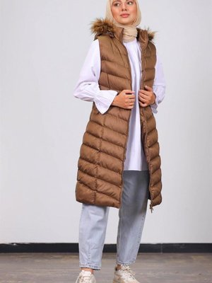 meqlife Kahve Kürklü Uzun Şişme Yelek