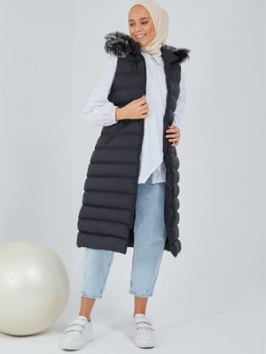 meqlife Siyah Kapüşonlu Uzun Şişme Yelek