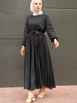 meqlife Siyah Sade Simli Kuşaklı Abiye Elbise