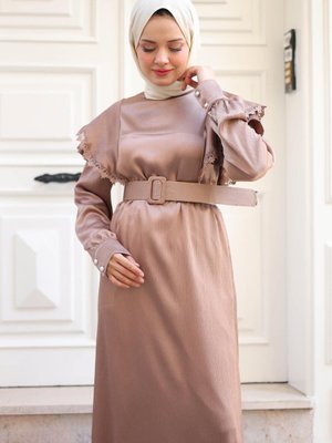 RENK: Nakış İşlemeli Saten Elbise Vizon