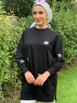 Moda Rosa Siyah Nakışlı Taşlı Sweat