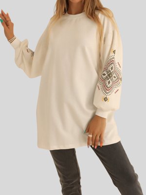 ADYES Ekru Kolları Baskılı Bisiklet Yaka İki İplik Sweat