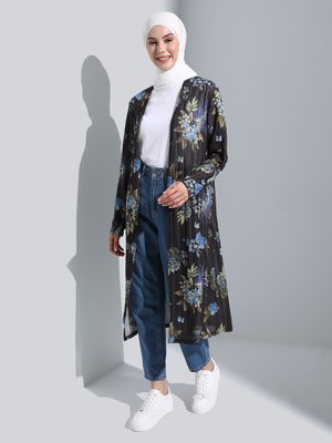 Respiro Çiçek Desenli Dökümlü Siyah Uzun Hırka