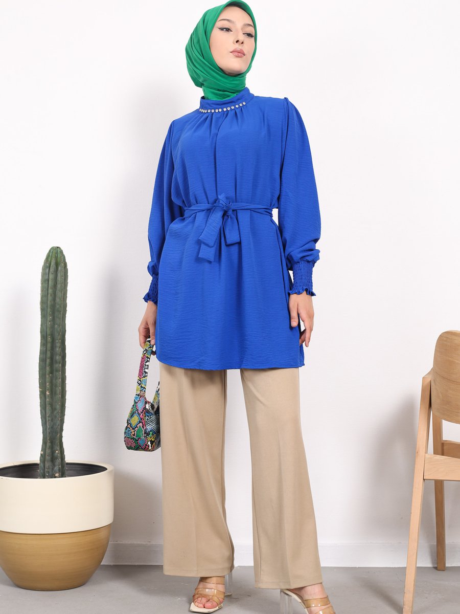 Vav Manşet Gipeli Yaka Taşlı Tunik Saks Mavi