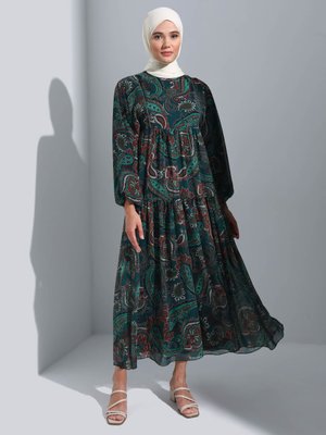 Refka Zümrüt Biye Detaylı Şal Desen Şifon Elbise