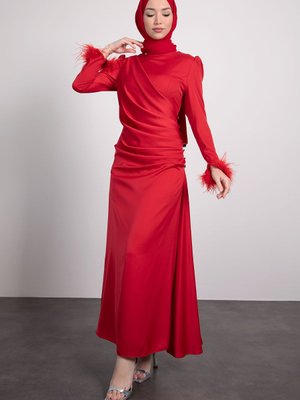 Lamia Giyim Önü Pilise Ve Düğme Detaylı Abiye Elbise Kırmızı