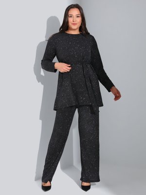Alia Bağlama Detaylı Büyük Beden Simli Takım - Siyah Sim -