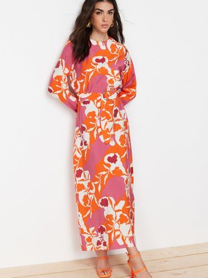 Trendyol Modest Pembe Kemerli Çiçekli Dokuma Elbise