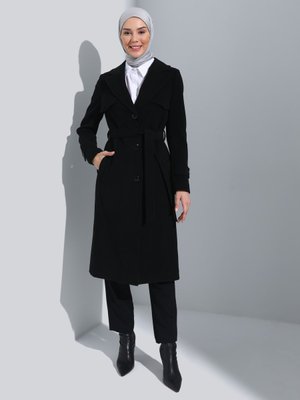 Olcay Siyah Pelerin Detaylı Düğme Kapamalı Belden Kuşaklı Kaban