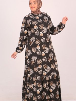 Moda Rosa Yaprak Desen Bej Büyük Beden Eteği Fırfırlı Kristal Elbise