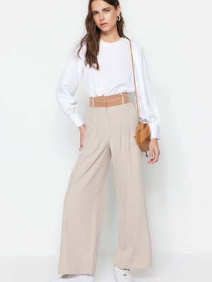 Trendyol Modest Bej Yüksek Bel Pili Ve Kemer Detaylı Geniş Paça Dokuma Pantolon