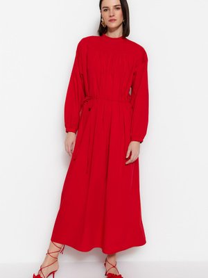 Trendyol Modest Kırmızı Kuşaklı Büzgü Detaylı Geniş Kalıp Dokuma Elbise