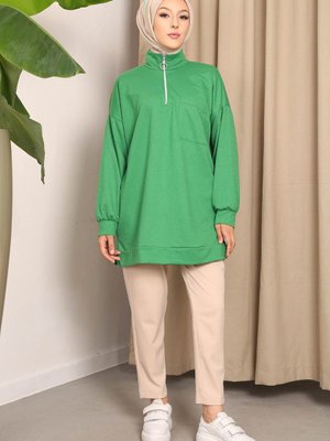 İmajbutik Yeşil Yaka Fermuarlı İki İplik Sweatshirt