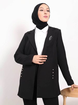 İmajbutik Siyah Yaka Bronşlu Cep Detaylı Ceket