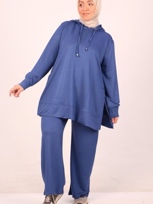 Moda Rosa İndigo Büyük Beden Kapüşonlu İki İplik Pantolonlu Takım