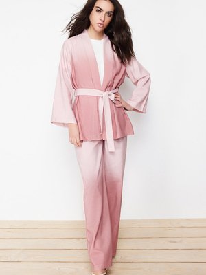 Trendyol Modest Mor Keten Görünümlü Dokuma Kimono Pantolon Alt Üst Takım