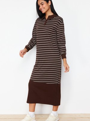 Trendyol Modest Kahverengi Çizgili Polo Yaka Örme Elbise