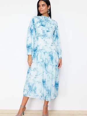 Trendyol Modest Mavi Astarlı Çiçek Desenli Kuşaklı Dokuma Elbise