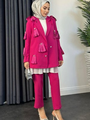 Haza Moda İthal Taşlı Ceketli Takım Fuşya