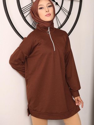 İmajbutik Kahverengi Yaka Fermuarlı İki İplik Sweatshirt