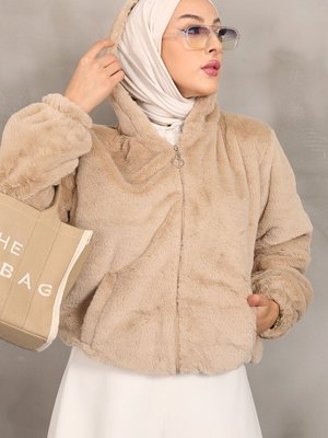 İmajbutik Bej Kapüşonlu Peluş Mont
