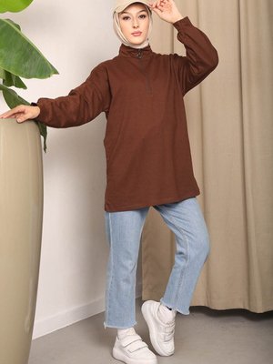 İmajbutik Kahverengi Yaka Fermuarlı İki İplik Sweatshirt