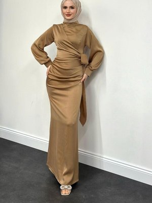 Mervenakyuz Orlenda Drape Detay Balık Saten Abiye Elbise Vizon