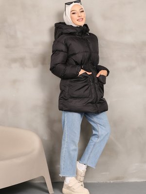 İmajbutik Siyah Kapüşonlu Cepli Büzgülü Şişme Mont