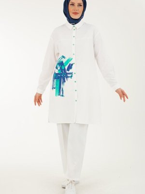 Armine Renkli Düğmeli Fırça Desenli Gömlek Yaka Tunik