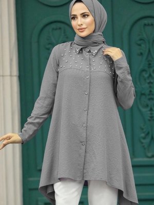 Neva Style İnci Detaylı Gri Tunik