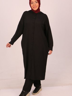 Moda Rosa Siyah Büyük Beden Bürümcük Kapüşonlu Nakışlı Takım