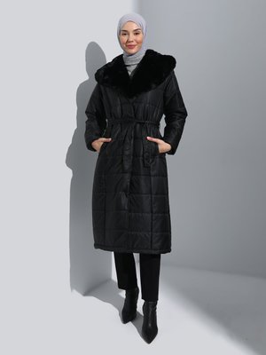 Olcay Siyah Yakası Çıkabilen Kürklü Ara Boy Kapitone Mont