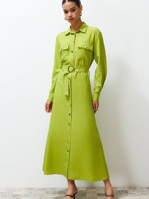 Trendyol Modest Bej Düz Gold Düğme Detaylı Dokuma Elbise