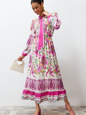 Trendyol Modest Fuşya Çiçekli Bordür Desenli Dokuma Elbise