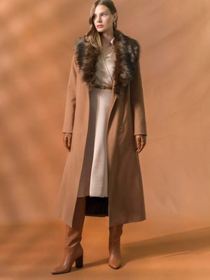 Olcay Çıkabilen Kürklü Beli Bağlamalı Uzun Boy Kaban Taba