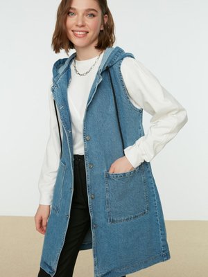 Trendyol Modest Açık Mavi Pamuk Kapüşonlu Cep Detaylı Yıkamalı Denim Yelek