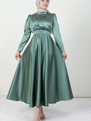 Giz Astore Omzu Taşlı Saten Abiye Elbise Soft Yeşil