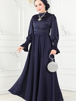 Moda Selvim Lacivert Manşeti Volanlı Saten Abiye Elbise