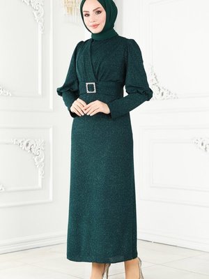 Moda Selvim Zümrüt Balon Kollu Simli Abiye Elbise