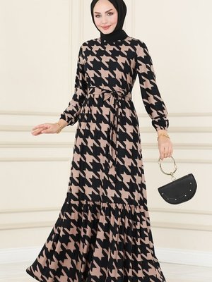 Moda Selvim Siyah & Vizyon Eteği Fırfırlı Desenli Elbise