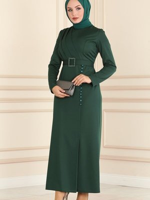 Moda Selvim Zümrüt Aksesuar Düğmeli Kalem Elbise