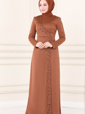 Moda Selvim Taba İnci İşlemeli Elbise