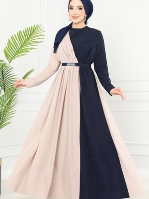 Moda Selvim Vizyon & Lacivert Çift Renkli Kemerli Elbise