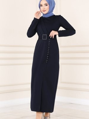 Moda Selvim Lacivert Aksesuar Düğmeli Kalem Elbise