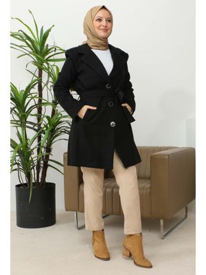İmaj Butik Siyah Kruvaze Yaka Astarlı Cepli Kaşe Kaban