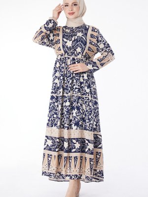 Tofisa Düz Hakim Yaka Lacivert Beli Lastikli Desenli Elbise