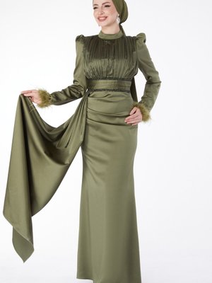 Tofisa Düz Hakim Yaka Haki Kollu Tüylü Yakası Pileli Abiye Elbise