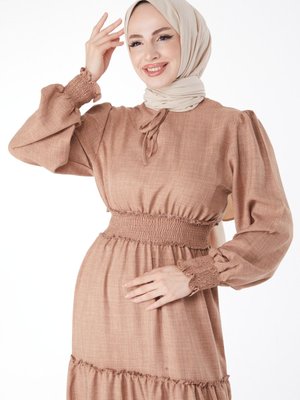 Tofisa Düz Bisiklet Yaka Vizon Gipe Detaylı Elbise