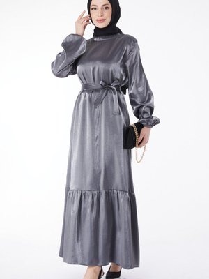 Tofisa Düz Hakim Yaka Siyah Parlak Kuşaklı Elbise