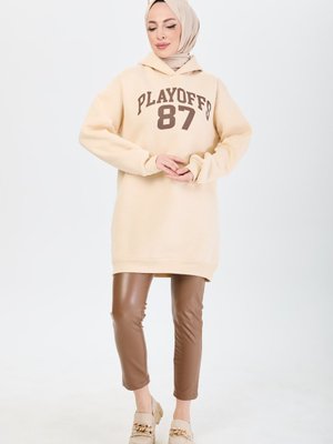 Tofisa Krem Baskılı Kapüşonlu Uzun Oversize Sweatshirt